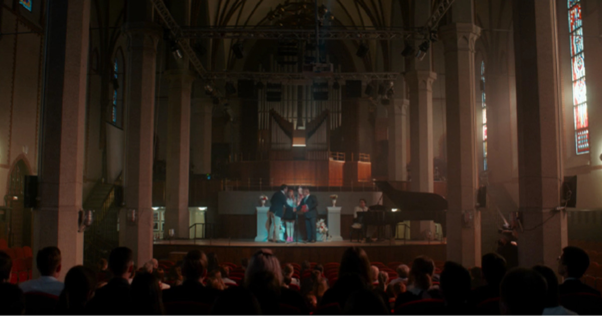 Здесь, по сюжету картины Сони Карпуниной, доцент кафедры психологии Сергей Навашин получает премию «Лучший педагог года»