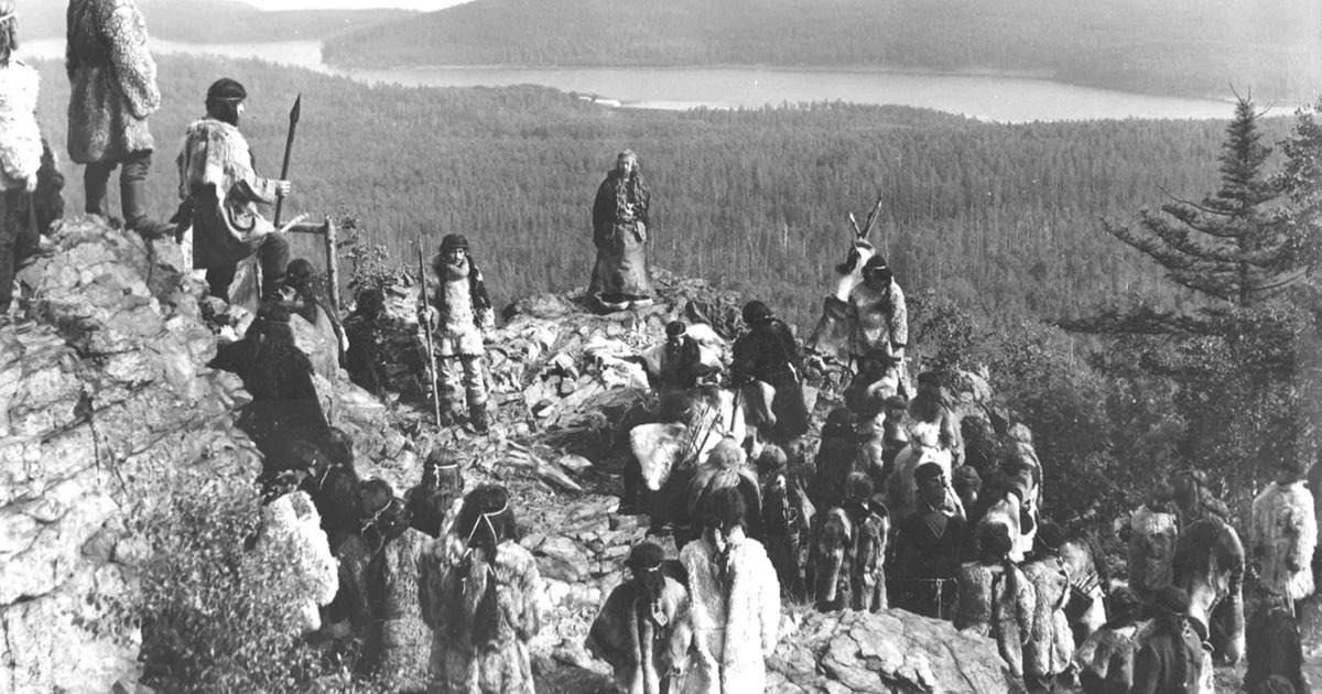 1234 год. На начальных кадрах фильма «Золотая баба» племя вогулов поднимается в гору.