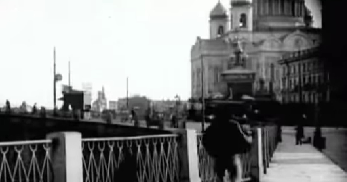 Сцена где героиня «прыгает с моста», а бдительный прохожий спешит к ней на помощь, запечатлела Храм Христа Спасителя до того момента, как он был снесён