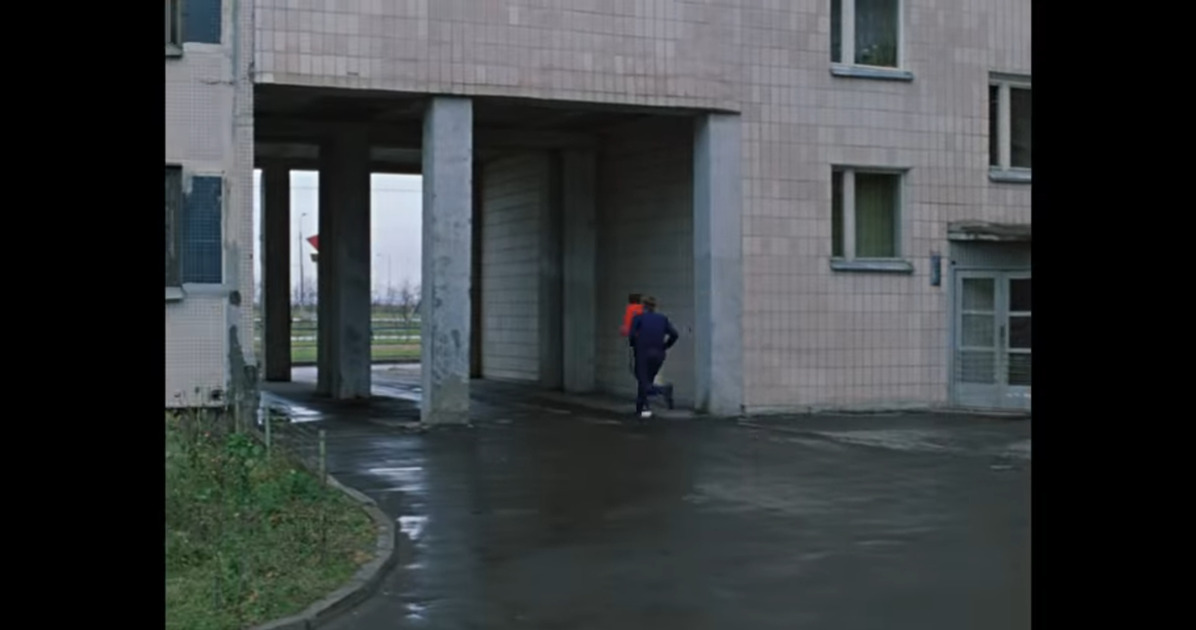 Бузыкин бегает с гостем из Дании по улице Кораблестроителей и выбегает на неё через арку дома N23.