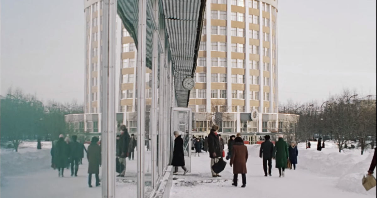 Герой короткометражки «Раньше было другое время» выходит из «Спорттоваров», на заднем фоне виден полукруг гостиницы Исеть.