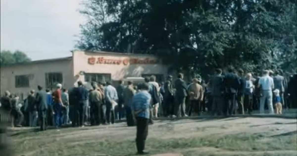 Очередь в вино-водочный магазин (фрагмент фильма 00:59:30 - 01:04:00). Сейчас это здание занимает магазин «Пятёрочка».