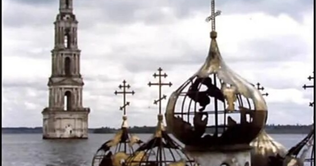 В кадре - колокольня Никольского собора Николо-Жабенского монастыря. Перед созданием Угличского водохранилища собор взорвали и разобрали. Колокольню решили не взрывать, а оставить как маяк. Позже она стала использоваться как вышка для прыжков с парашютом. После этого вокруг колокольни насыпали искусственный островок и построили причал для лодок. Существует легенда: когда с колокольни сбрасывали колокол, он упал в подвал и его затопили. По словам местных жителей они слышали некий звон. На следующий день после звонка началась Великая Отечественная война... Такое же происшествие случалось до начала сильного землетрясения в Ашхабаде и войны в Афганистане. До сих пор никто не знает правда это или нет.