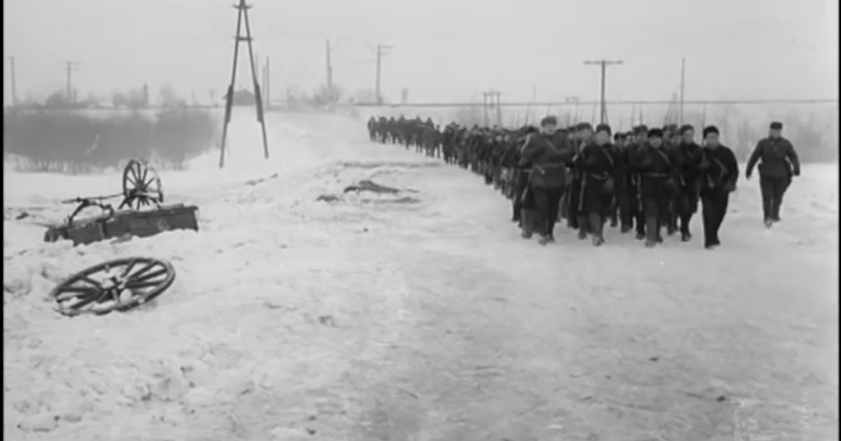 На основном изображении мы видим колонну добровольцев у Шелковского переезда (на заднем плане). На кадрах хорошо узнается высокая насыпь переезда и крутой поворот Можайского шоссе.