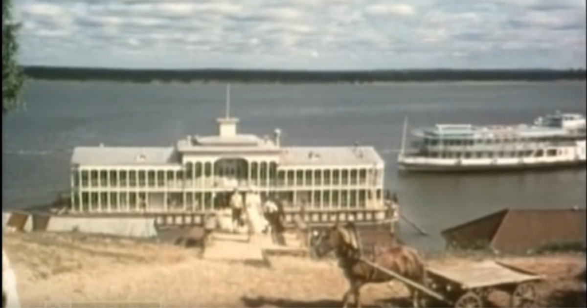 Главные герои фильма спустившись по лестнице идут к пристани к подходящему пароходу