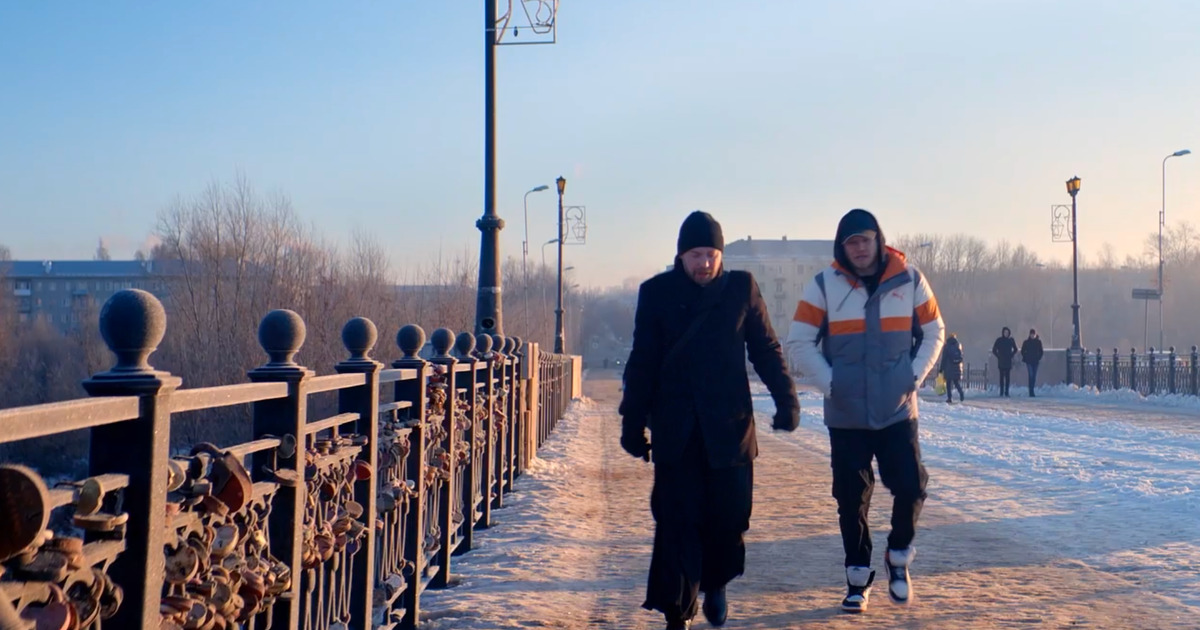 Друзья детства - блогер Дима (Виктор Хориняк) и алтарник Сергей (Сергей Аброскин) идут по мосту.