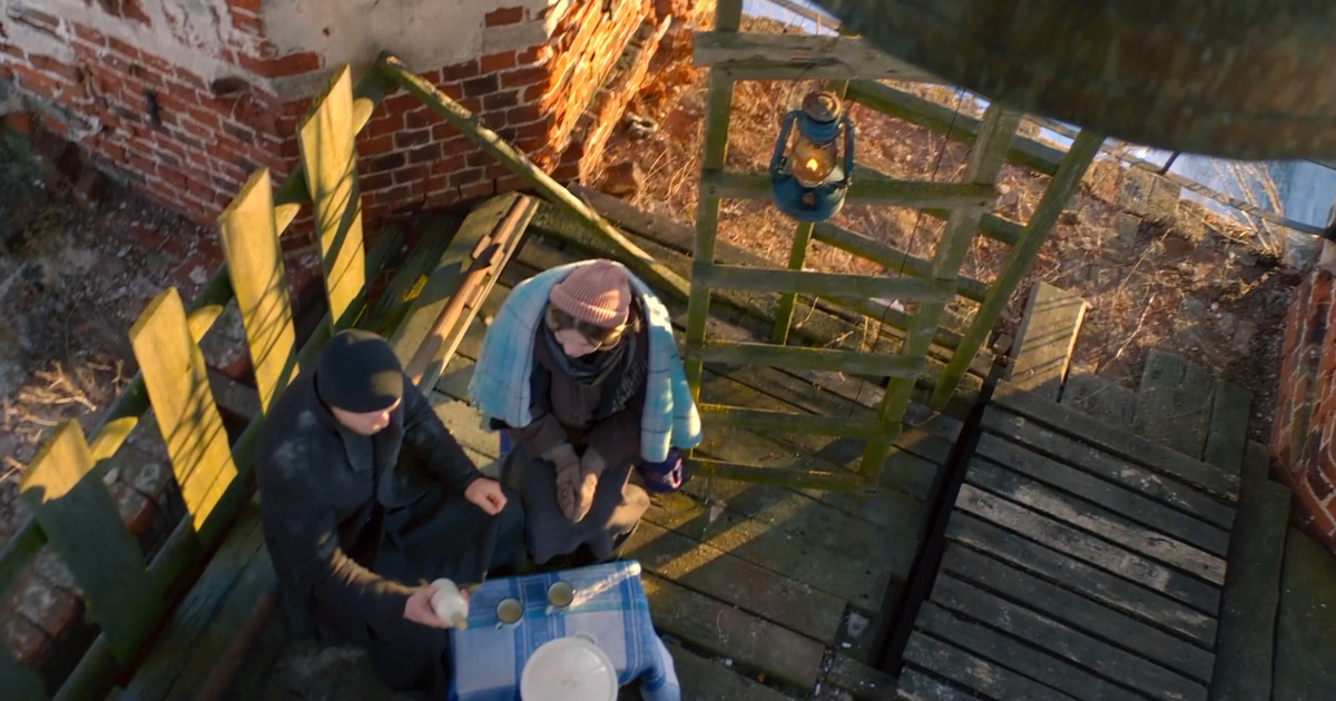 На самую высокую площадку пятиярусной колокольни забираются послушник Дима (Виктор Хориняк) и ученица иконописной школы Настя (Таисия Вилкова), чтобы познакомиться поближе.