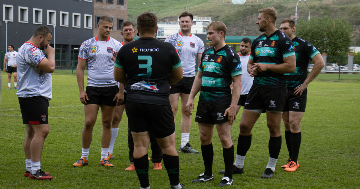 Игра в регби на стадионе, друзья Виктора следят за его игрой, губернатор Александр Усс наблюдает за игрой