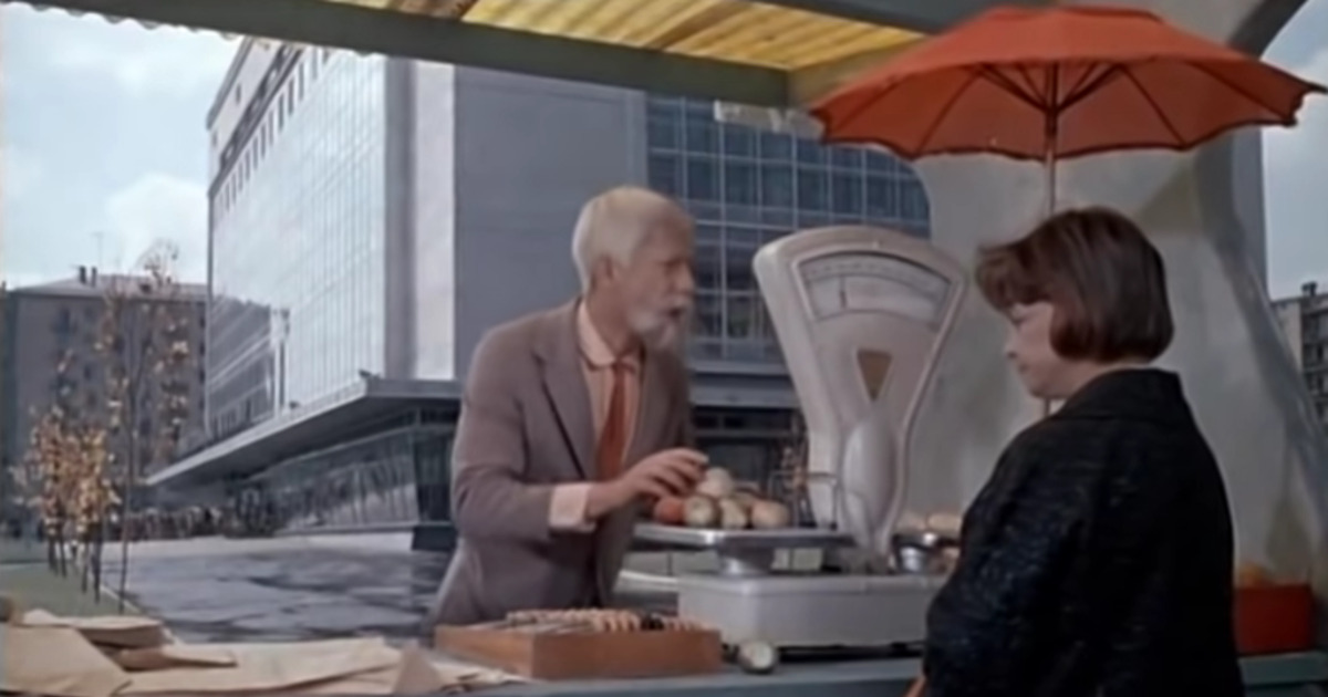 Здесь, по сюжету фильма Александра Птушко, пожилой Петя пытается продавать яблоки