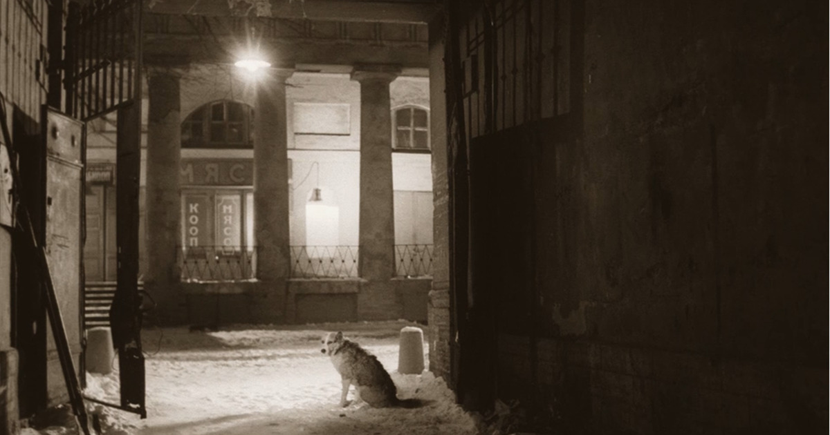 Бездомный пёс, размышляющий о своей сложной судьбе, сидит в подворотне. Этот кадр снят на Боровой улице, 3. Напротив Ямского рынка и произойдёт судьбоносная встреча профессора Преображенского с собакой.