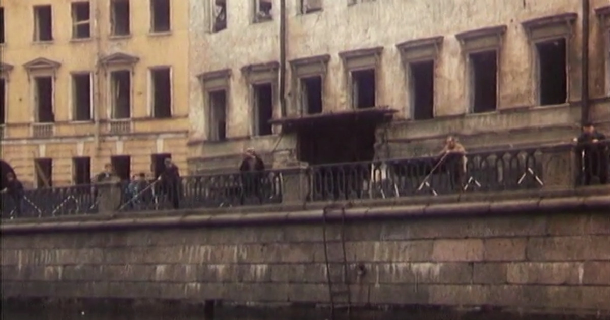 Набережная канала Грибоедова, 89. В кадре Николай, которого уволили из школы, идет вдоль старинных построек. Здесь он встречает своего соседа Ивана Кузьмича, безуспешно ловившего рыбу. Но, как известно, рыбы в канале быть тогда не могло: он был очень грязный и замусоренный. Единственное, что можно было выловить – это изделия. В наши дни дом, который находится за спиной Кузьмича, – разрушен