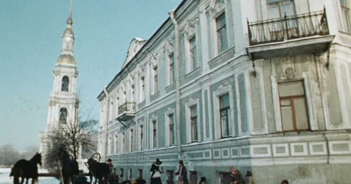 Дама, за которой следит Кочкарев, идет вдоль дома причта Николо-Богоявленского собора, сначала в кадре видна колокольня собора, потом и он весь.