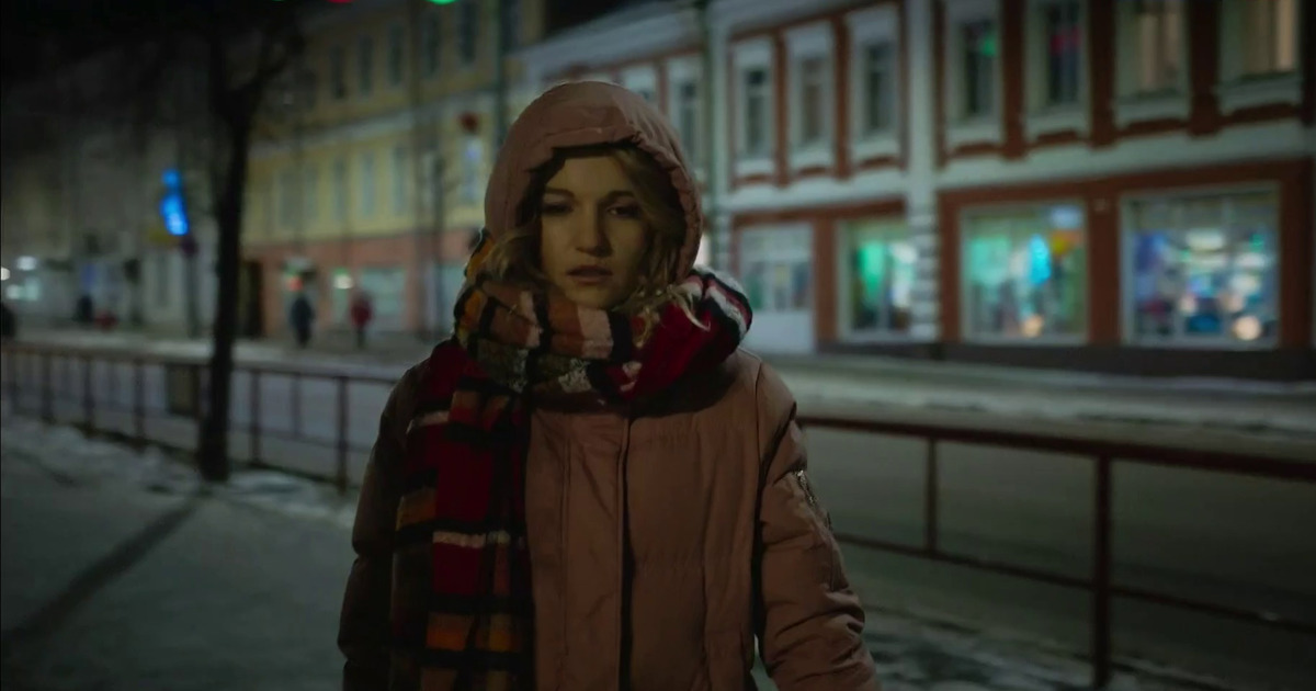 Героиня актрисы Евгении Малаховой в одиночестве возвращается после бара, проходя вдоль этих улиц, а за ней следует автомобиль.