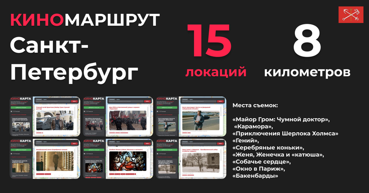 Легкий прогулочный пеший маршрут по центральной части Санкт-Петербурга, протяженностью 8 км, на котором располагаются кинолокации как минимум 10 известных фильмов и сериалов. Следуя по нему, вы обнаружите дом профессора Преображенского из «Собачьего сердца» и места, в которых обитал Шарик до того, как стал человеком, клуб «Диоген» из советского Шерлока Холмса, замок немецких баронов из «Женя, Женечка и катюша». А также места съемок современных российских лент, например, сериала «Карамора» и несколько локаций из проектов, ставших всемирно известными благодаря Netflix - кинокомикса «Майор Гром: Чумной доктор» и романтической сказки «Серебряные коньки».