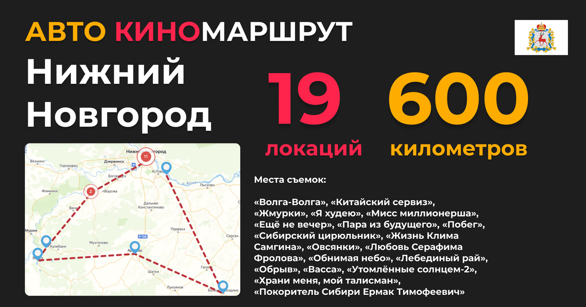 Удивительный по красоте нижегородский край стал великолепной натурой для целого ряда известных фильмов. «Обрыв», «Васса», «Сибирский цирюльник», «Утомлённые солнцем-2», всего с этой землей связана история почти 90 фильмов, первым из которых стал «Покоритель Сибири Ермак Тимофеевич» (1914), он частично снимался в районе Мызы. Предлагаем комбинированный маршрут по местам съемок, в который вошло около 19 локаций. Часть из этих точек, расположенных в исторической части Нижнего Новгорода, мы предлагаем обойти пешком, а вторая часть маршрута, пролегает по областным населенным пунктам, включая города Павлово и Арзамас, а также знаменитый музей-заповедник «Болдино». Общая протяженность маршрута составляет около 600 км.